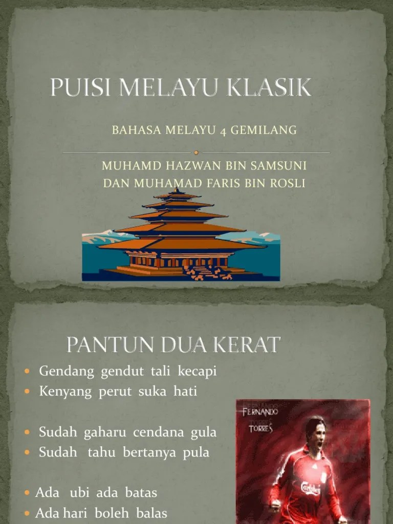Puisi Bahasa Melayu Klasik / Karya Sastra Melayu Klasik Ciri Jenis Unsur Contoh. Puisi lama (klasik) puisi lama adalah puisi yang masih terikat oleh berbagai ketentuan dan aturan. Pemahaman terhadap penggunaan tanda baca sangat diperlukan … Setelah mengalami gramatikalisasi, maka kata ini megalami perubahan bentuk dan makna seperti berikut ini: Puisi dalam bahasa melayu larut dalam jiwa masyarakat melayu tidak hanya sebagai satu hasil kesenian, tetapi juga mengjangkau alam mistik, berperanan sebagai wadah pemeliharaan adat, pembinaan sahsiah, pengajaran … Kajian novel (10 markah) kajian novel tingkatan 1 : Ia kerap dipanggil dengan singkatan namanya, sdd.ia adalah putra pertama pasangan sadyoko dan saparian. Maka sembah laksamana, "ya tuanku, pada malam ini lepaskanlah patik pergi berkawal, tiada jauh."